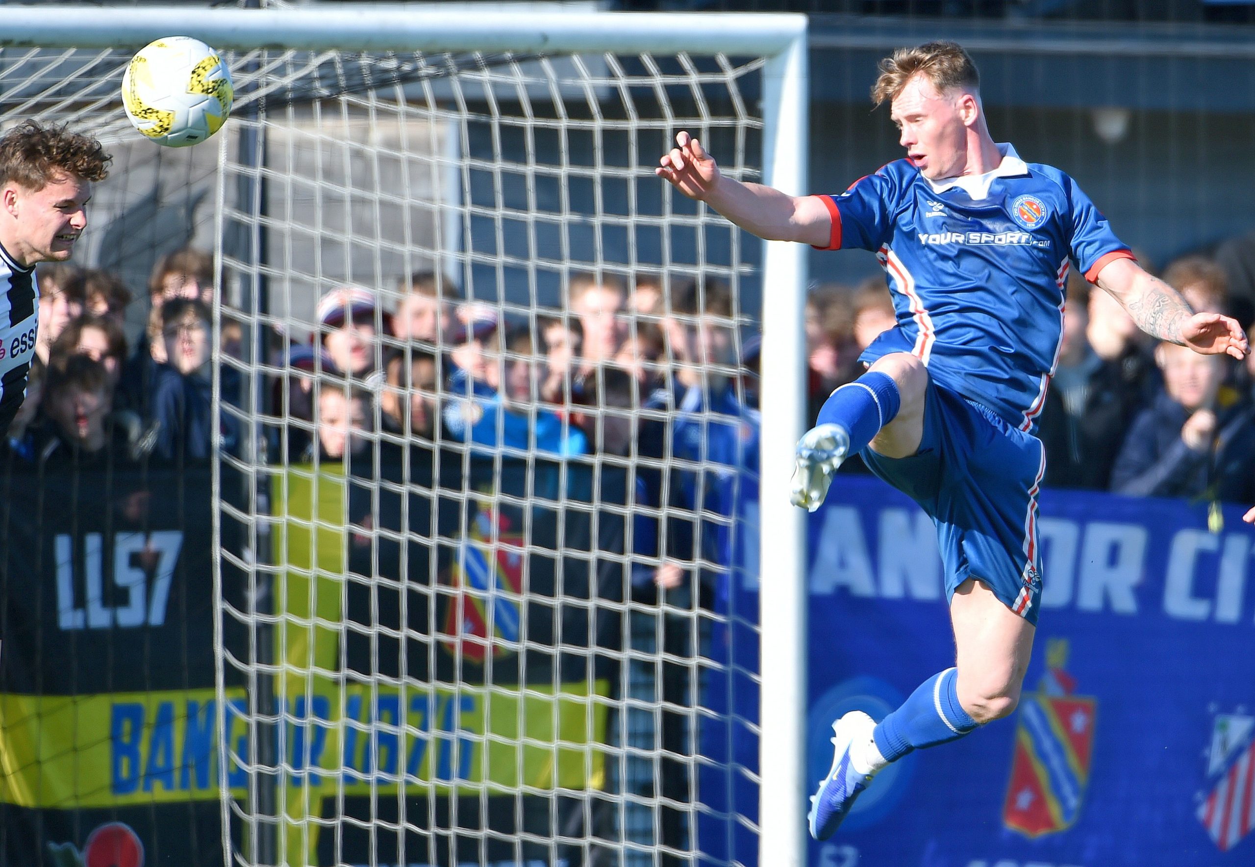 Bangor’s best chance of a very much one sided first half came when their captain Tom Clarke met a corner and placed his header just wide of the target just after the half hour mark.