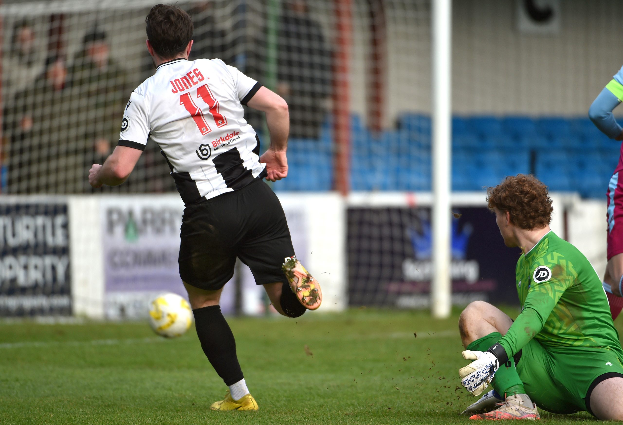 Five minutes into the second half, and Flint carved out another decent opportunity. A good passing move saw Jones released on the right, and he got to the bye-line before pulling the ball back to Canavan, who from a well placed position lifted it over the bar. However, within 60 seconds, frustration turned to joy from a Flint point of view, as they eventually broke the deadlock. From the resulting goal kick after Canavan’s miss, Fofana won a header, and directed it in-between a couple of defenders for Jones to run onto. The striker duly obliged, reaching the ball just ahead of Brown who came racing out to the edge of is box. Jones then cleverly poked it through the keeper’s legs and set it on its way into the goal.